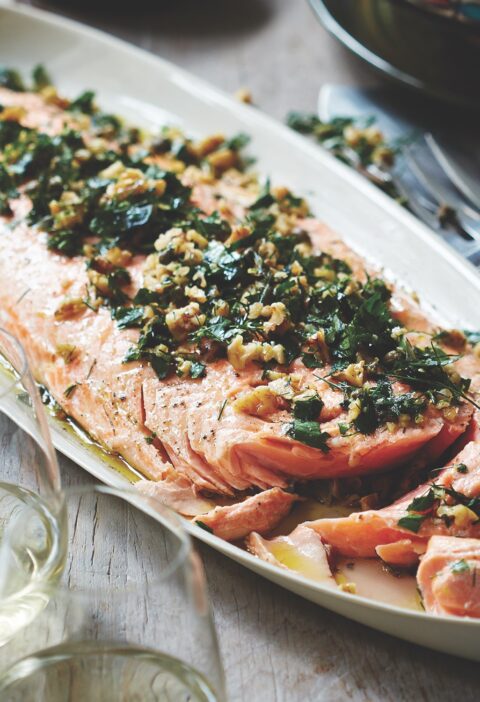 Coat the salmon in the rub of cumin, coriander, paprika, lemon zest and lemon juice, extra virgin olive oil and a pinch of salt.
